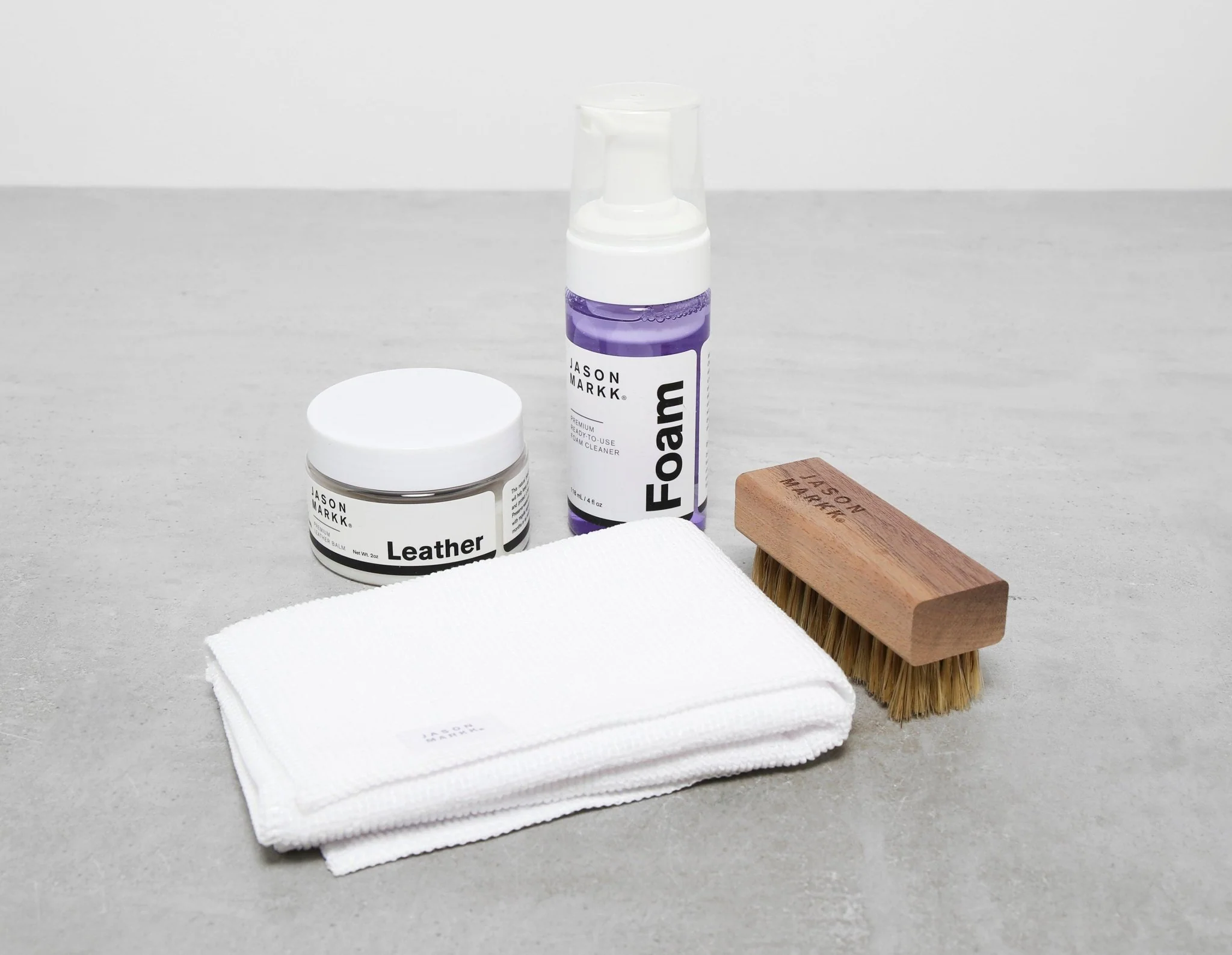 Jason Markk's Leather Care Kit includes the 4oz Ready-To-Use Foam Cleaner that cleans and conditions all materials, the Premium Leather Balm - a bio-based blend of beeswax and coconut oil, the Premium Cleaning Brush, and the Premium Microfiber Towel.